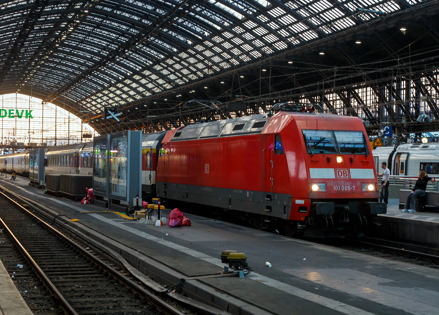 Die DB 101 005-7 (91 80 6101 005-7 D-DB) der DB Fernverkehr AG, fährt am 01 Juli 2025, mit dem EC 6 (Interlaken Ost - Bern - Basel SBB – Mannheim - Köln Hbf - Dortmund Hbf), mit über 2 Stunden Verspätung in den Hauptbahnhof Köln ein. Hinter der DB 101er sind SBB EuroCity-Wagen. Die EuroCity-Wagen (Apm EC und Bpm EC) der SBB sind zwar nach ähnlichen Prinzipien aufgebaut worden, werden aber in der Schweiz nicht als Einheitswagen bezeichnet.