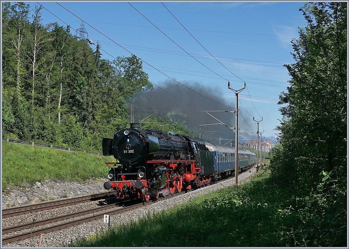 Die 01 202 eilt mit ihrem wunderschönen blauen Zug pünktlich wie die Eisenbahn kurz nach Bussigny an mir vorbei. Die Dampflok und ihre Wagenpark sind auf der Fahrt von Genève nach Lyss (via Biel.