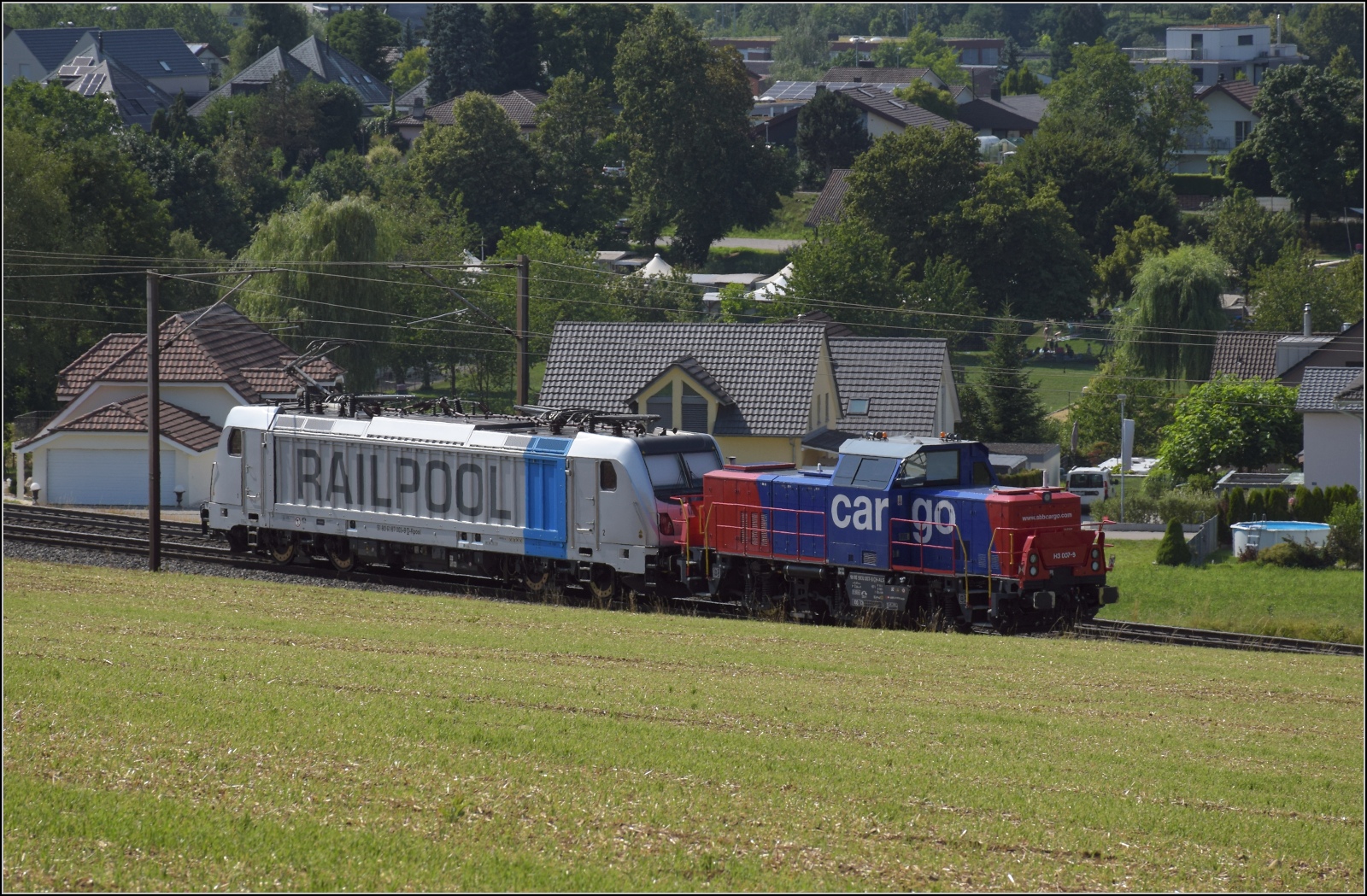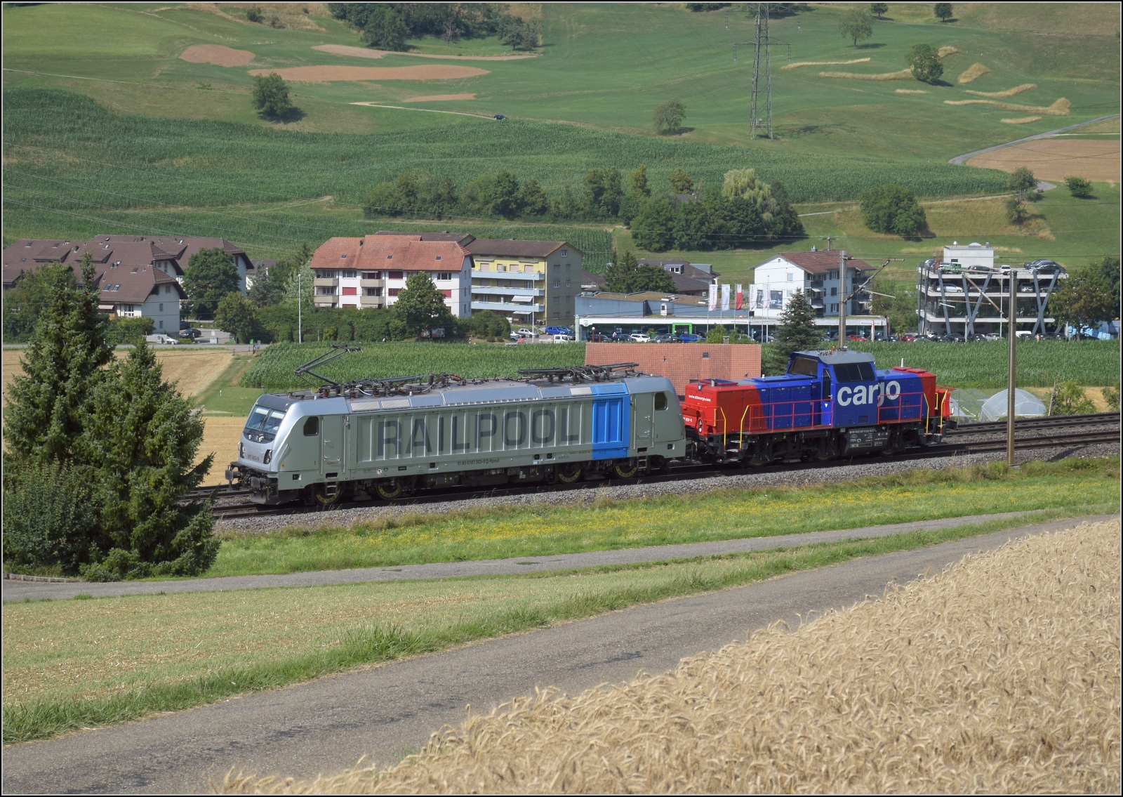 187 002 von Railpool, dahinter kalt 186 104 unterwegs Richtung Brugg noch nördlich von Frick.