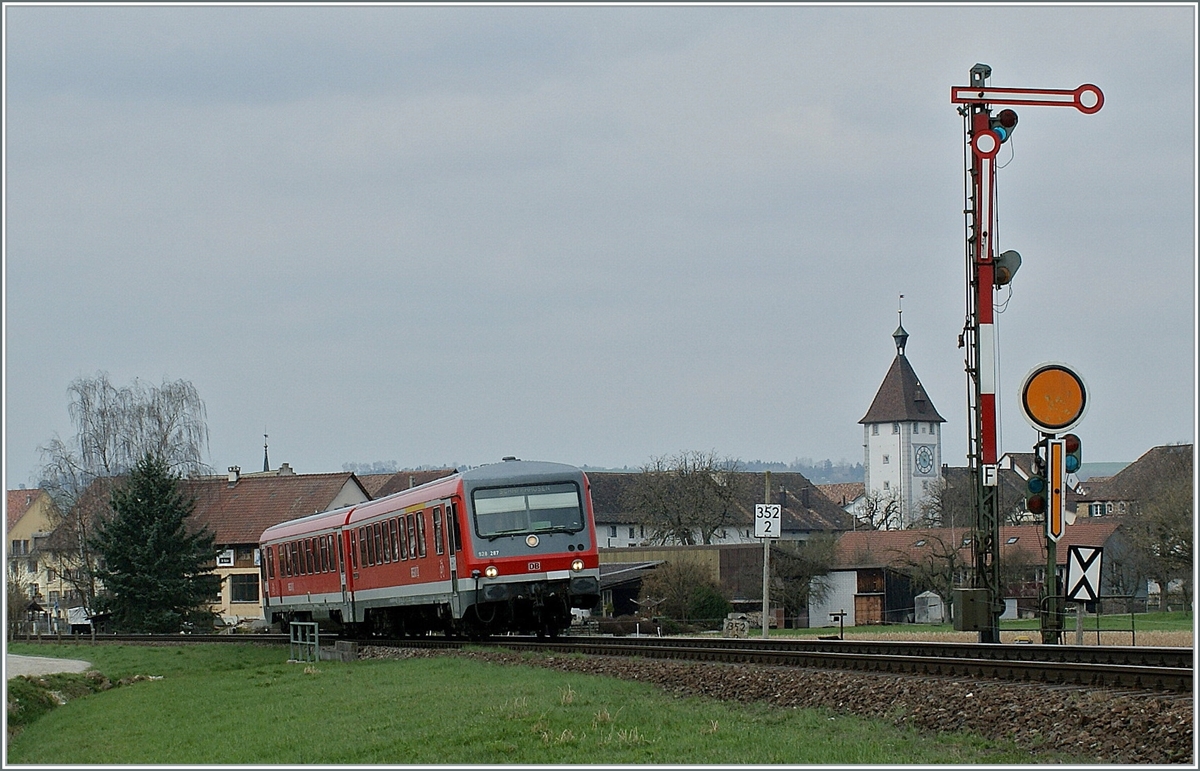 Der DB 628 287 / 928 287 auf der Fahrt nach Erzingen (Baden) beim Halt in Wilchingen - Hallau. Allein die Barrieren Anlage im Hintergrund zeigt, dass dieser DB Bahnhof sich in der Schweiz befindet.