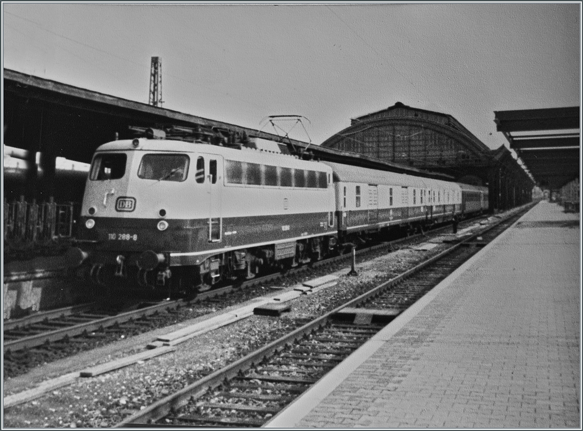 Die DB 110 288-8 mit ihrem Schnellzug nach Dortmund ist nur vordergründig das Motiv dieses Bildes. Der Grund, weshalb ich dieses qualitativ etwas schlechte Bild zeige ist vielmehr die Bahnhofshalle von Basel Bad Bf., bzw. was zu Zeitpunkt der Aufnahme davon noch übrig war.