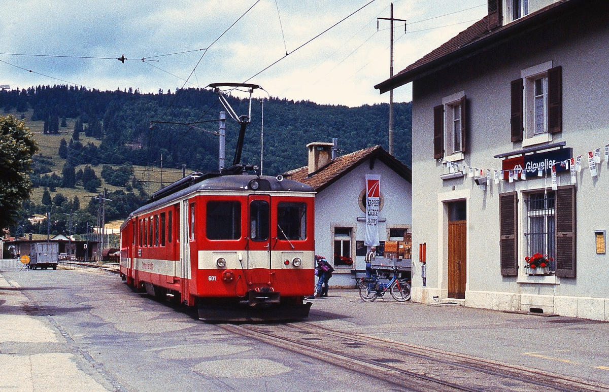 Im Sommer 1997 ist der BDe 4/4 II 613 mit einem Zug aus La-Chaux-de Fonds in Glovier angekommen. Zu diesem Zeitpunkt fanden anlässlich des 150-jährigen Jubiläums der schweizer Eisenbahnen Dampfsonderfahrten sowohl auf der SBB-Strecke nach Delemont als auch auf der CJ statt, die Parkplätze dürften sonst nicht so gut gefüllt gewesen sein. Horst Lüdicke
