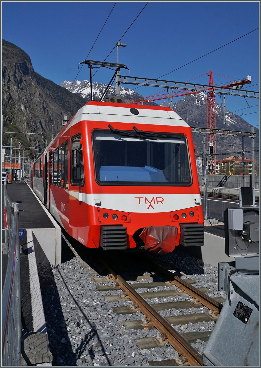 TMR Beh 4/8 N° 72 mit der UIC Nummer 72 (UIC 90 85 838 072-4 CH-TMRSA) wartet in Martigny auf die Abfahrt nach Vallorcine. Hier zeigt sich der Höhenunterschied zum SBB Bahnsteig sehr deutlich, hingegen erfolgt nur Zugang in den Triebwagen stufenlos.