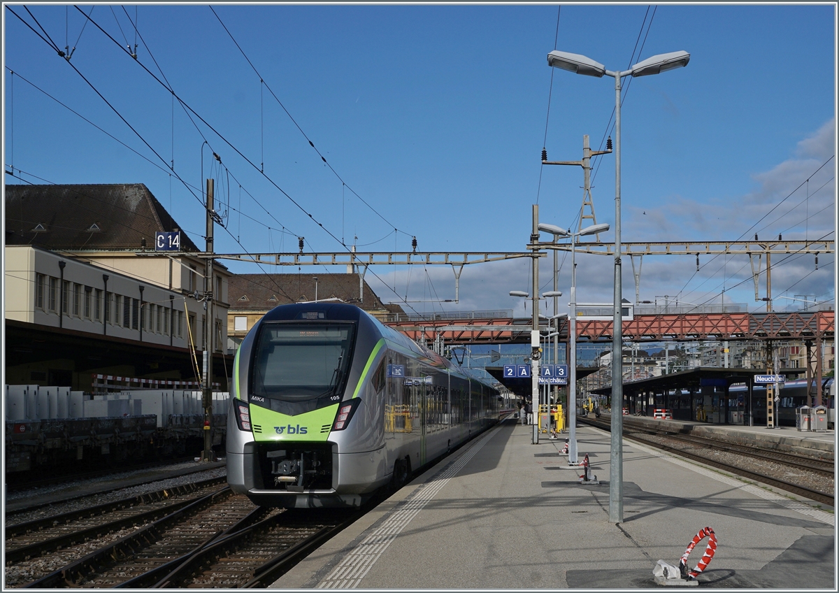 Die Ablösung der EW III: der MIKA. Der BLS 528 105 erreicht als IR von Bern kommend Neuchâtel. Baustellenbedingt endet hier die Fahrt (statt in La Chaux-de-Fonds).