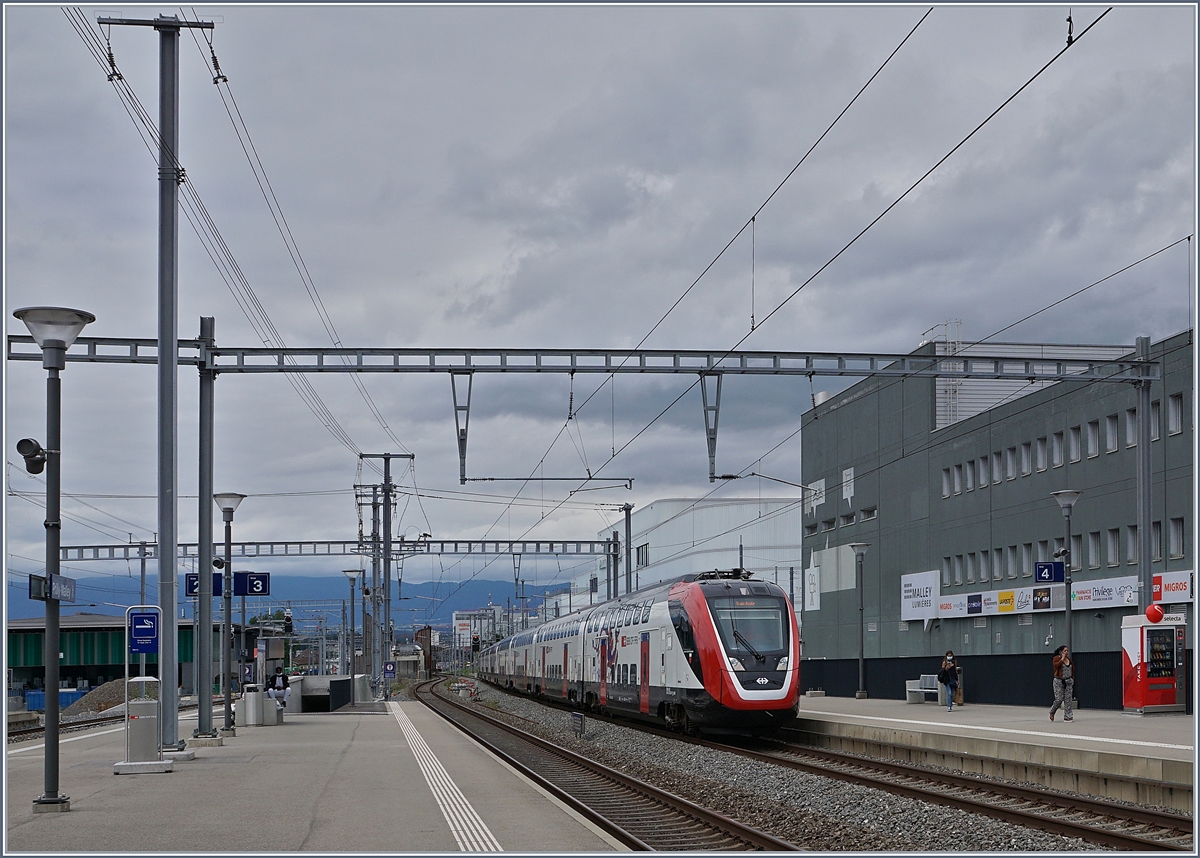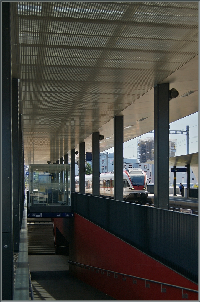 Der Tilo Flirt RABe 524 009 (ETR 524/ UIC 94 85 2 524 009-9) wirkt in der Umgebung des modernen Bahnhofs von Prilly-Malley schon nicht mehr so Taufrisch. 10. Juli 2015
