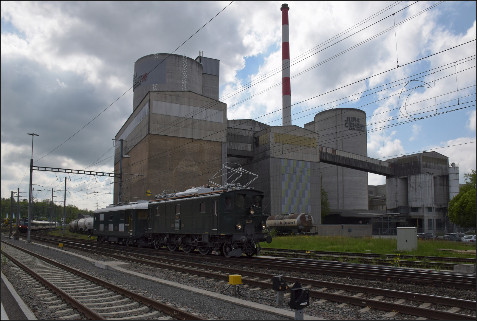 Das Bild zeigt eine Ae 3/5 mit einem Personenzug Lyss - Herzogenbuchsee bei der Ankunft in Büren an der Aare.