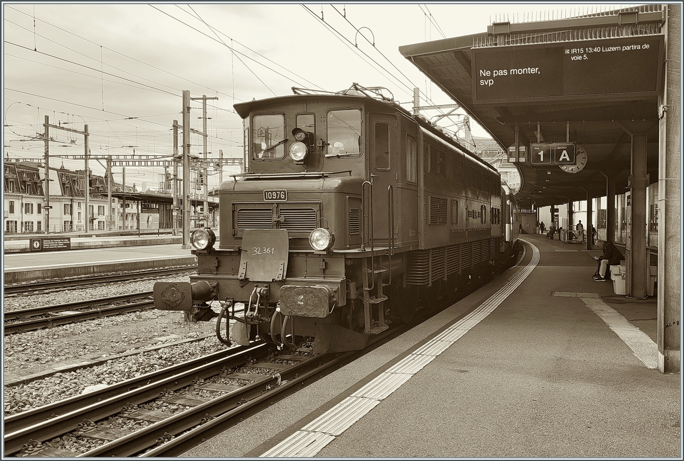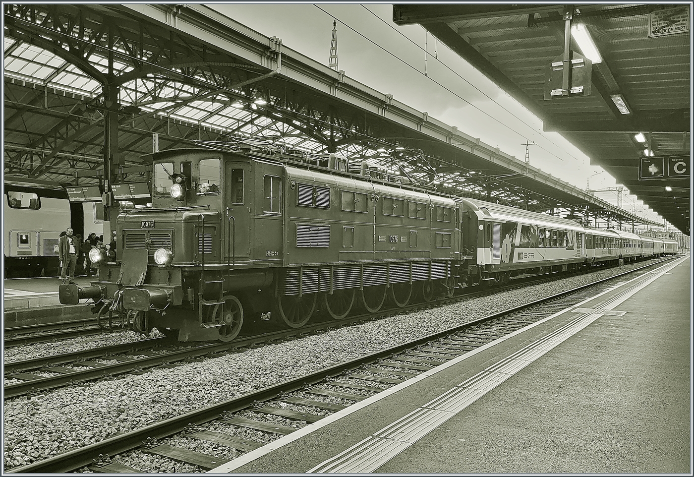 Die Ae 4/7 10997 mit dem nur aus einem Wagen bestehenden Sonderzug zur Tatoo -Vorstellung in Basel wartet in Lausanne auf die Abfahrt.