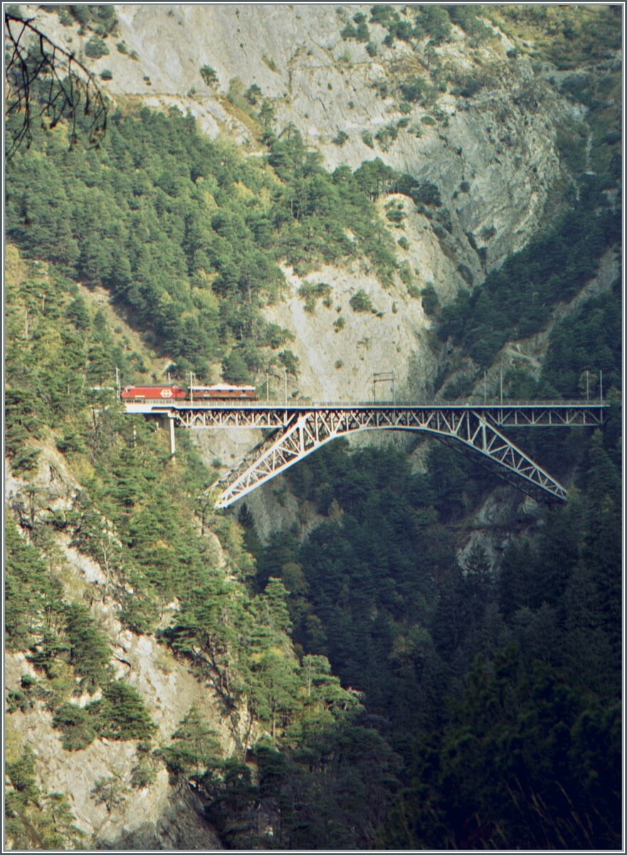 So schlecht das Bild, so genial das Sujet: eine BLS Ae 6/8 leistet einer SBB Re 460 Vorspanndienst! Das Bild entstand auf dem Südrampen-Wanderweg der BLS und zeigt, soweit ersichtlich die Bietschtal Brücke mit einem IC nach Brig.