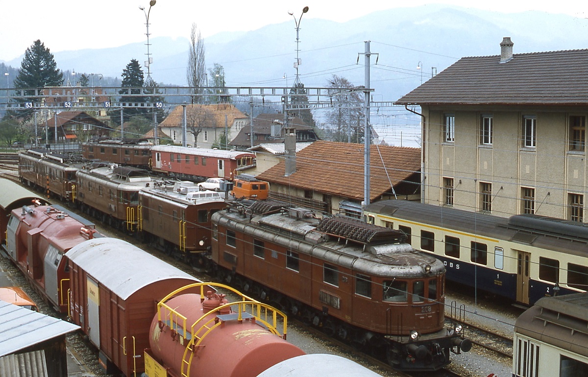 Blick ins Depot Spiez Anfang Mai 1981: Hinter Ae 6/8 208 sind neben einer Ce 4/4 zwei weitere Ae 6/8 und eine Ae 8/8 zu erkennen