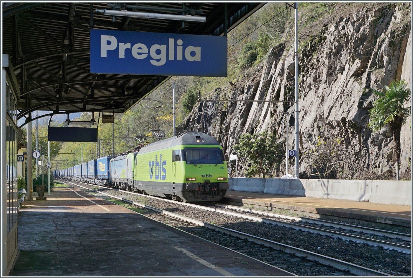 Die BLS Re 465 015-6 mit einem Schnellzug in Richtung Lausanne beim Halt in Martigny.