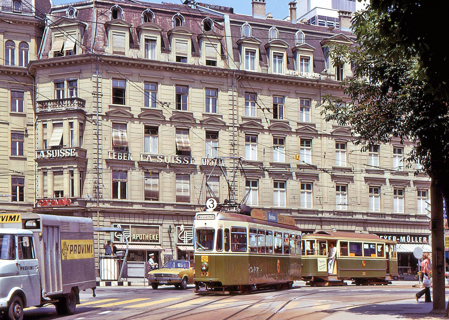 Die beiden Vierachsanhänger 311 und 312 aus Bern von 1933: Die Speisewagenkomposition 147-312 auf der Mittleren Brücke über den Rhein in Basel, 27.Oktober 1982