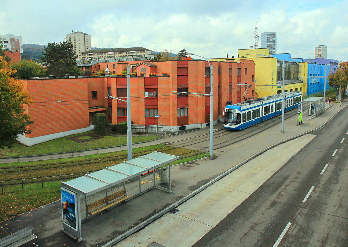 Die VBZ-Tram - Be 5/6 3028, eine Bombardier Cobra, als Linie 4 zum Bf. Tiefenbrunnen am 07.06.2015 beim Halt an der Station Technopark (Zürich). Blick von unserem Hotel.