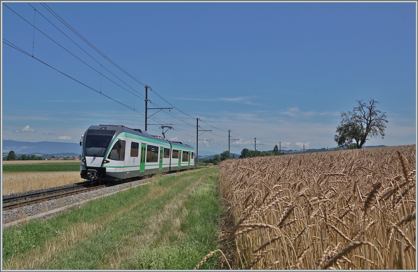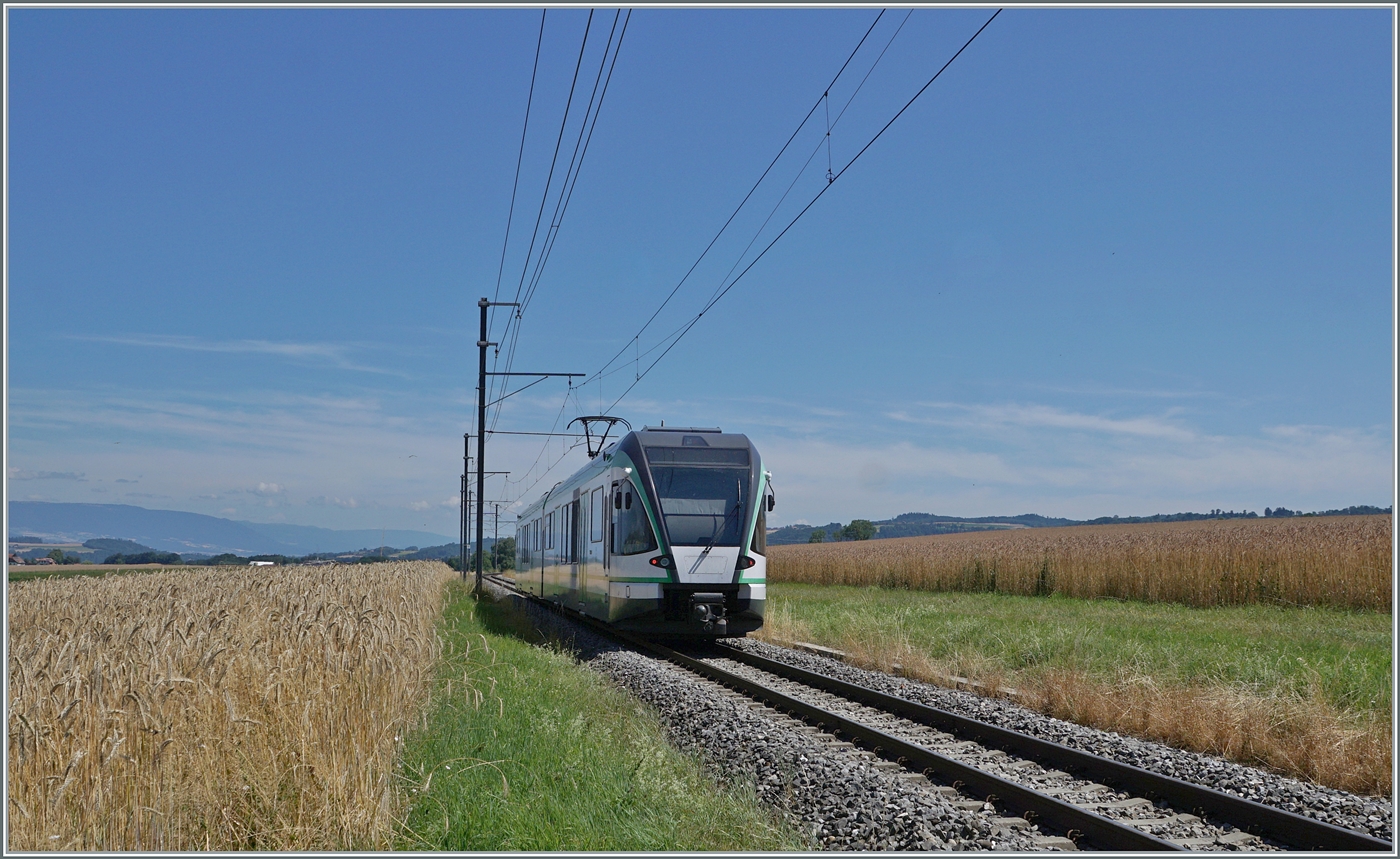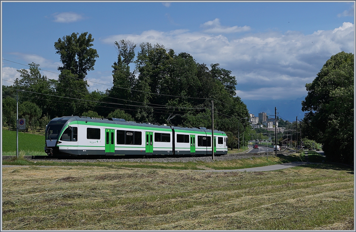 Der RBe 4/8 49 und LEB Be 4/8 35 "Romanel" erreichen die Station Jouxtens-Mézery.